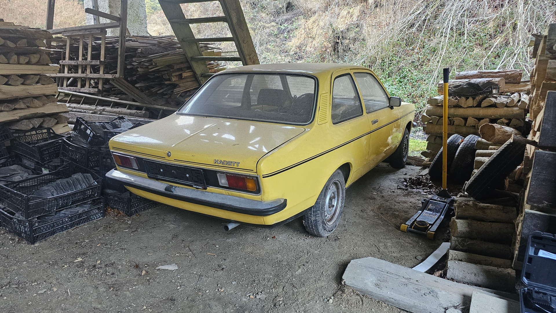Je brez motorja in menjalnika, notranjost je pobrana ven in jo lahko dodam, je pa voznikov sedež v slabem stanju oz. uničen. Zraven je tudi kompletno podvozje s platišči. Nekje se mi valjajo tudi 3 originalna “športna” platišča od Kadetta potrebna obnove, tudi te z veseljem dodam, prav tako lahko še nekaj drugih drobnarij.
