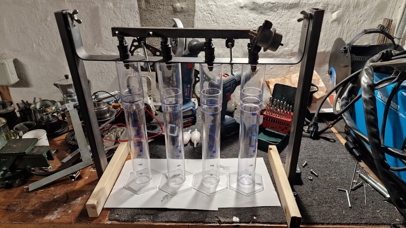 Na strani injektorjev sem naredil nosilec zanje ter pokoristil fabriški fuelrail ter regulator tlaka, v enološkem društvu pa so mi prodali plastične merilne valje za količino izbrizganega goriva.