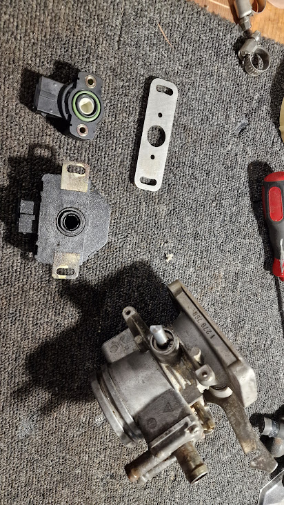 Demontiran senzor v primerjavi z novim; razlika ni le v velikosti in pritrditvenih luknjah, ampak tudi v orientaciji - utor na potenciometru je za 180 stopinj rotiran. Sicer nekateri montirajo senzor kar tako, da potem konektor in kabli močno tiščijo v sesalni kolektor, pa tudi odklop konektorja brez fizične demontaže senzorja pri takem načinu montaže ni več mogoča.