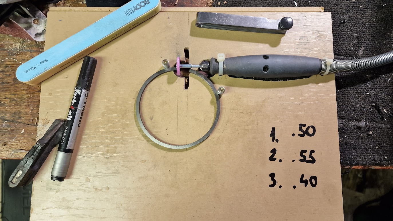 Pri brušenju naj bi bilo zelo pomembno, da se obroček odbrusi čimbolj pravokotno na tangento obročka. Ker ročna natančnost ne bi dosegala minimalnih standardov, sem si na ploščo fiksiral nastavek od dremla z brusom, za pravo pozicijo obročka pa po precej merjenja dodal še štoperje, ki so zagotavljali pravokotnost obročka na brusno ploščico.