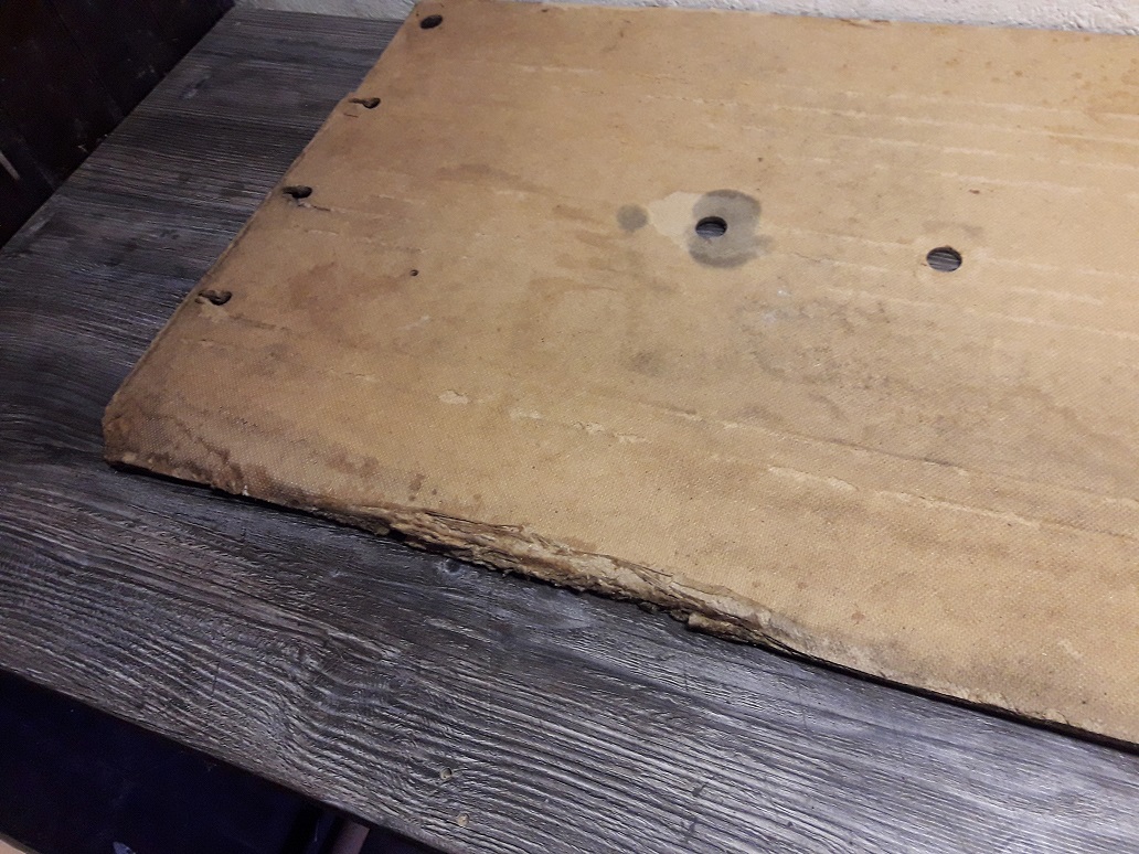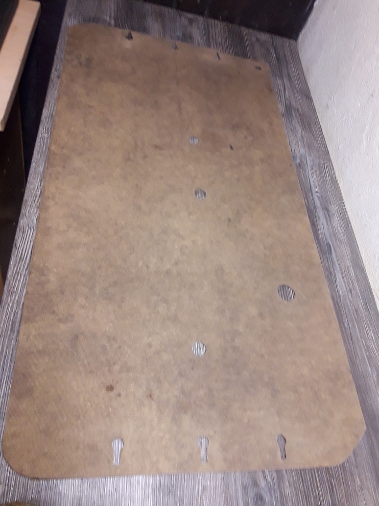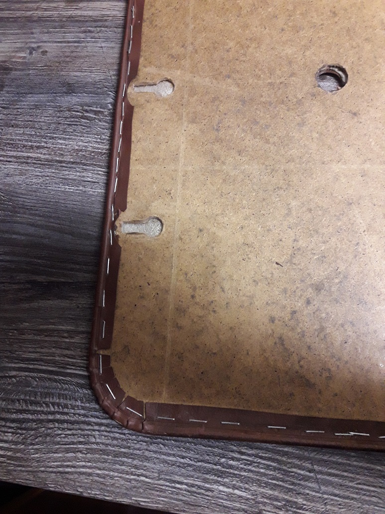 Lesonit sem na mestu kjer je poglodano in manjka tapeta skrajšal za 1cm, tapeto pa po limanju na lesonit pogrel z 500 stopinj fenom in povlekel čez rob. Ker ravno ne zaupam lepilu sem tapeto pritrdil z klamfami.