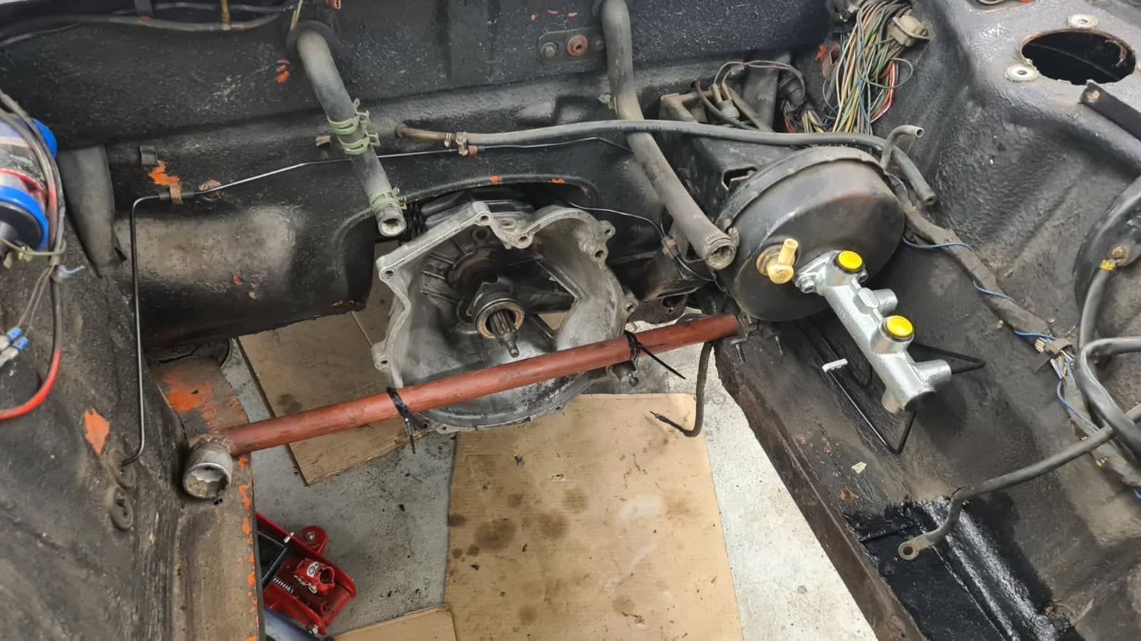 Brez menjalnika in motorja v avtu se da zadevo relativno hitro in solidno zmontirat, tako da sem bil po par urcah kar se šasije tiče fertik, vključno z montažo novega, večjega, bolj glavnega zavornega cilindra vred. Naslednji je bil na vrsti menjalnik, ki se je vzpel nazaj na svoje mesto po tem ko je dobil novega hidravličnega sužnja za sklopko, nove puše v prestavni ročici, nov nosilec in nove kontakte za stikalo rikverc luči. Note to self - nesmem pozabit nalit olja v menjalnik (novega)!!