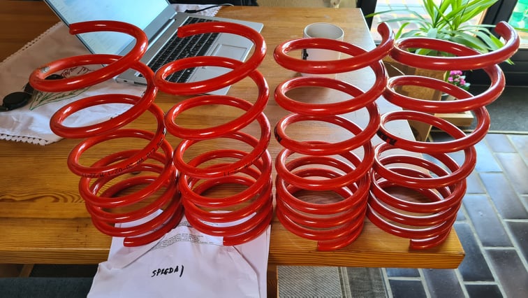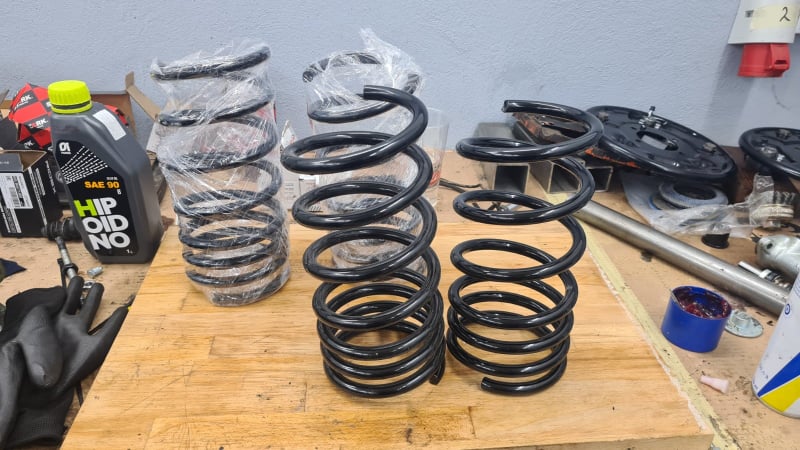 Ker sem star in si želim čim manj pozornosti na podvozju, sem jih nesel gumirat na črno. Zanimivo - sprednje vzmeti so krajše kot zadnje. Ne vem če je to pogost pojav, ampak tudi serijske so bile take. Vglavnem: