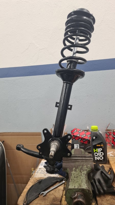 Po manjših težavah z manjkajočo pušo na eni strani (avto je imel na sebi ob prihodu dva različna amortizerja, različna različna - en Bilstein z debelo batnico (tako kot ma Miha) in en klasičen. Pač, domača sestavljanka, jebiga. Še dobro da v delavnici kjer gostujem ležijo tudi kosi starih Porschejev, in donirane sem dobil uporabne puše ki so sedaj del mojega podvozja :) Vzmeti so na srečo ravno dovolj nižje, da nisem rabil živet v strahu ob uporabi stiskalcev vzmeti, in sem lahko zgornjo kapo nataknil zgolj s pomočjo stiska roke.