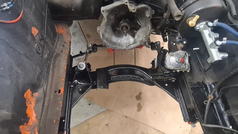Po preletu vijakov z navornim ključem, povezanju cilindrov sklopke in montaži posodice za hidraulično ulje je bil prednji del tako skupaj.