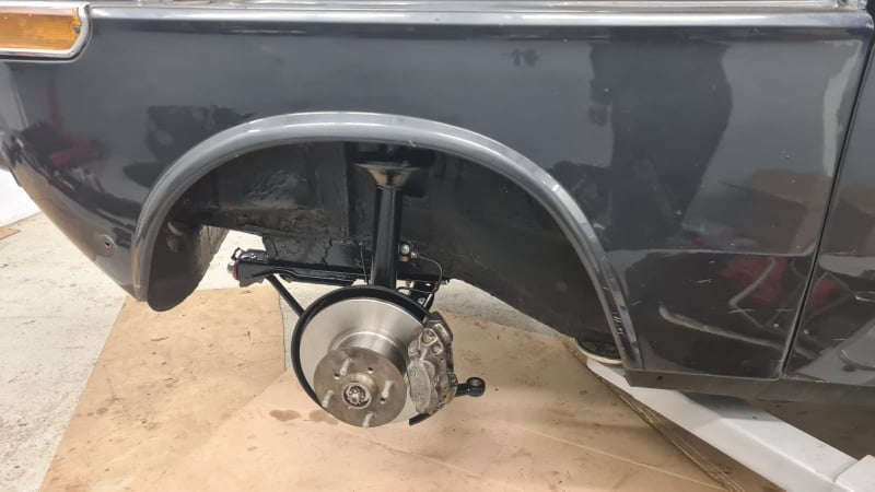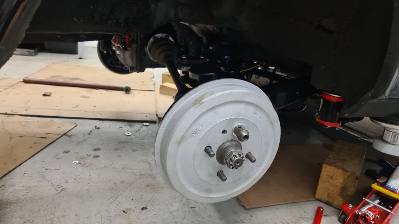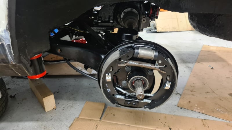 Zmontirale so se še nove zajle za ročno (pri sestavi ročice ročne zavore, katerega mehanizem in način sestavitve je očitno zdizajniral nek mazohist), nato pa so se nadele še zadnje zavore - tokrat bobni iz modela e21, kateri imajo večji primer (250mm - enak kot so imeli Turbo modeli). Manjša predelava je potrebna le okoli vzvodovja za ročno zavoro, drugače pa je zadeva precej bolt-on.