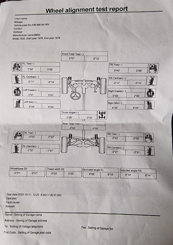 Vse je nekako OK, le zadaj desno je naklon camberja prevelik in v trenutni konfiguraciji nenastavljiv. Taisti gospod mi je tudi svetoval, da bi se dalo še marsikaj dodelat s predelavami, katere pri starejših BMWjih precej pomagajo tako pri nastavljanju avta v tovarniške vrednosti (50 let starim kantam se gladko poznajo kilometri tudi na takih stvareh, in moja ni izjema) kot tudi pri dirkalnih konfiguracijah. Glede na to, da so po trenutno montiranem mostu enkrat že nekaj čarali in je bil varjen, sem imel drugega že na lagerju, naročil svetovane kose ter jih vgradil.
