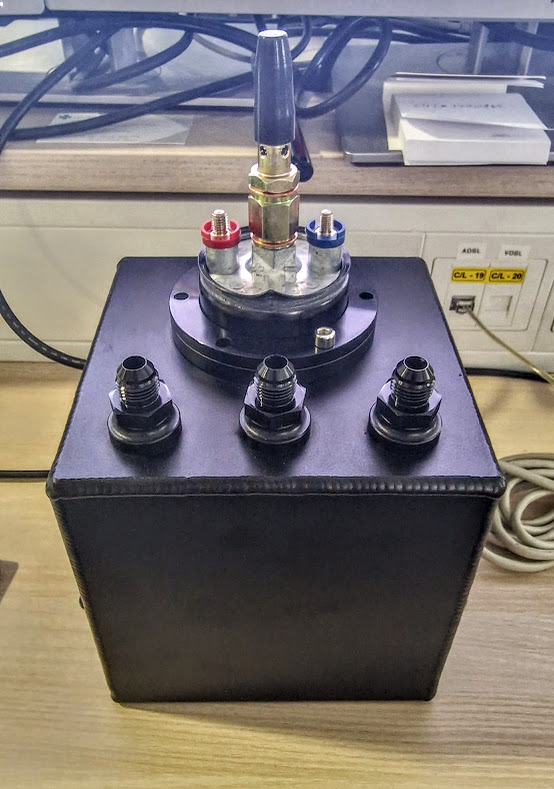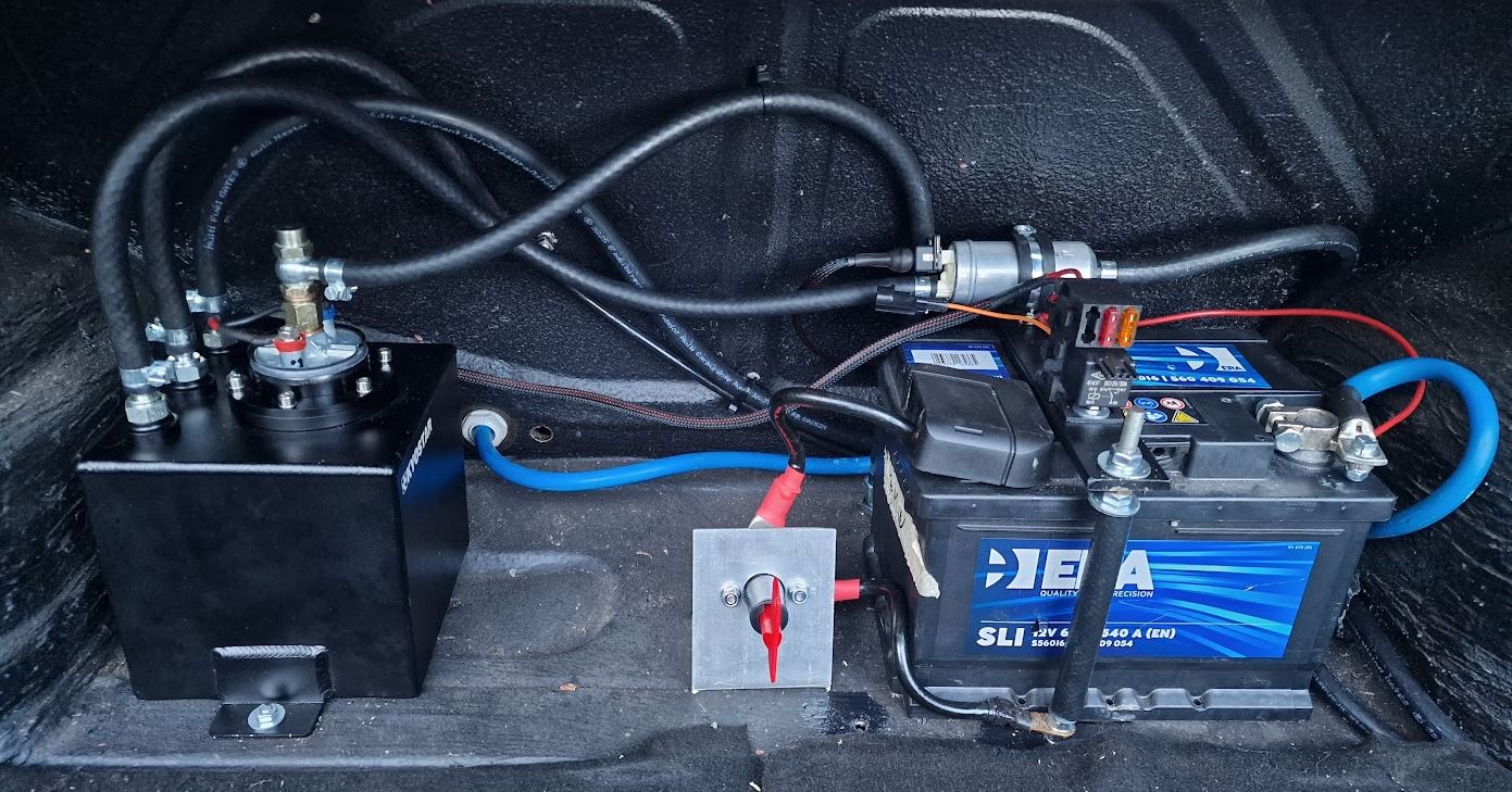 Za predelavo fergazerskega starodobnika na sodobnejši vbrizg in vžig je potrebno kar nekaj dela, če ne želiš ubrati čisto vsake bližnjice in narediti stvar kolikortoliko OK. Po tem, ko sem imel motor že delujoč na elektroniki zunaj šasije in izdelano električno motorno vejo, sem na avtu moral napeljati še "visokotlačni" (+-3 bar) dovod goriva s povratnim vodom, kar pa sem zaradi vbrizgu neprimernega rezervoarja goriva še dodatno zakompliciral s t.i. Surge tankom, vmesnim rezervoarjem, ki skrbi da visokotlačni črpalki ne zmanjka goriva pri daljših ovinkih in nižjem nivoju goriva v tanku. Visokotlačna črpalka stanuje kar direktno v tem rezervoarčku, le-tega pa napaja dodatna, nizkotlačna črpalka, ki črpa gorivo iz obstoječega dovoda. Takole pridemo do dveh povezanih tokokrogov bencina, torej: Glavni rezervoar -> nizkotlačna črpalka -> surge tank -> visokotlačna črpalka -> blažilnik, injektorji in regulator -> povratni vod v surge tank -> glavni rezervoar.