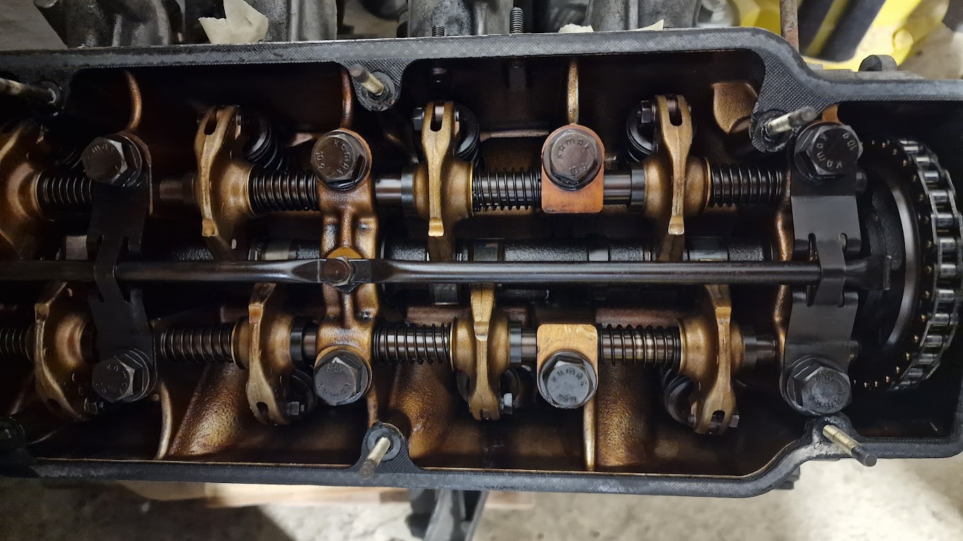Na koncu sem vstavil še varovalo odmične in klackaličnih osi, začasno vrnil še pogonski zobnik (verižnik?) ter nastavil zračnost na predpisanih 0.20mm. Nastavljanje ventilov je pri teh glavah prava pesem, v primerjavi s sistemom zračnohlajencev - s premikanjem ekscentričnega valjčka spreminjamo zračnost med njim in ventilom, na mesto ga pa zategnemo z vijakom, ki je fiksiran v samo klackalico in ob zategovanju le-tega ne spremeni nastavljene distance.