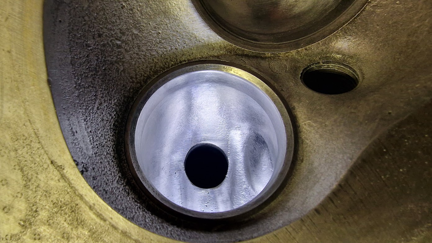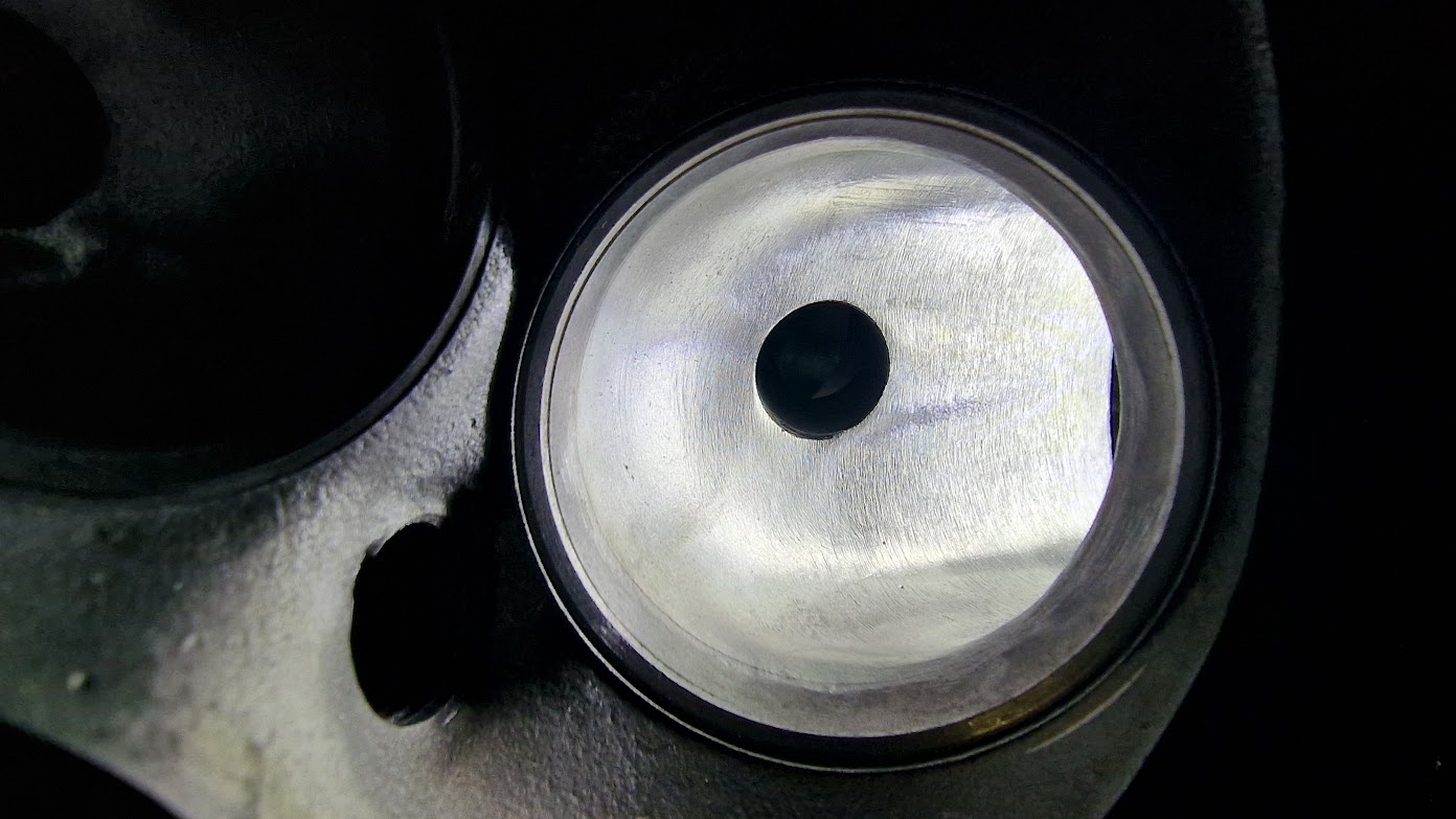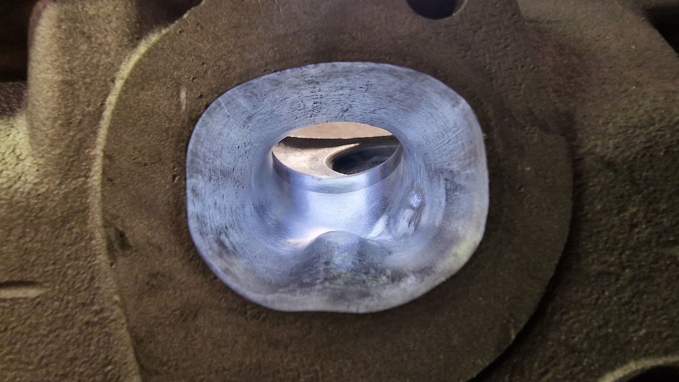 S temi dodelavami se sicer ne nadejam nekih superiornejših pridobitev in niti nimam flowbencha, s katerim bi lahko preveril rezultate svojega kraspanja aluminija, se posledično tudi ne grem (in ne znam iti) "pravega" portanja s spreminjanjem oblike in velikosti portov kot so si jih zamislili inžinerji v tovarni, le odpravim napake velikoserijske proizvodnje. Osredotočil sem se na odstranitev robov pri izvrtinah ob vgradnji sedežev ventilov, "zblendanje" prehoda iz sedeža v aluminijast del ter napak v odlitkih kanalov. Rezultat je takle: